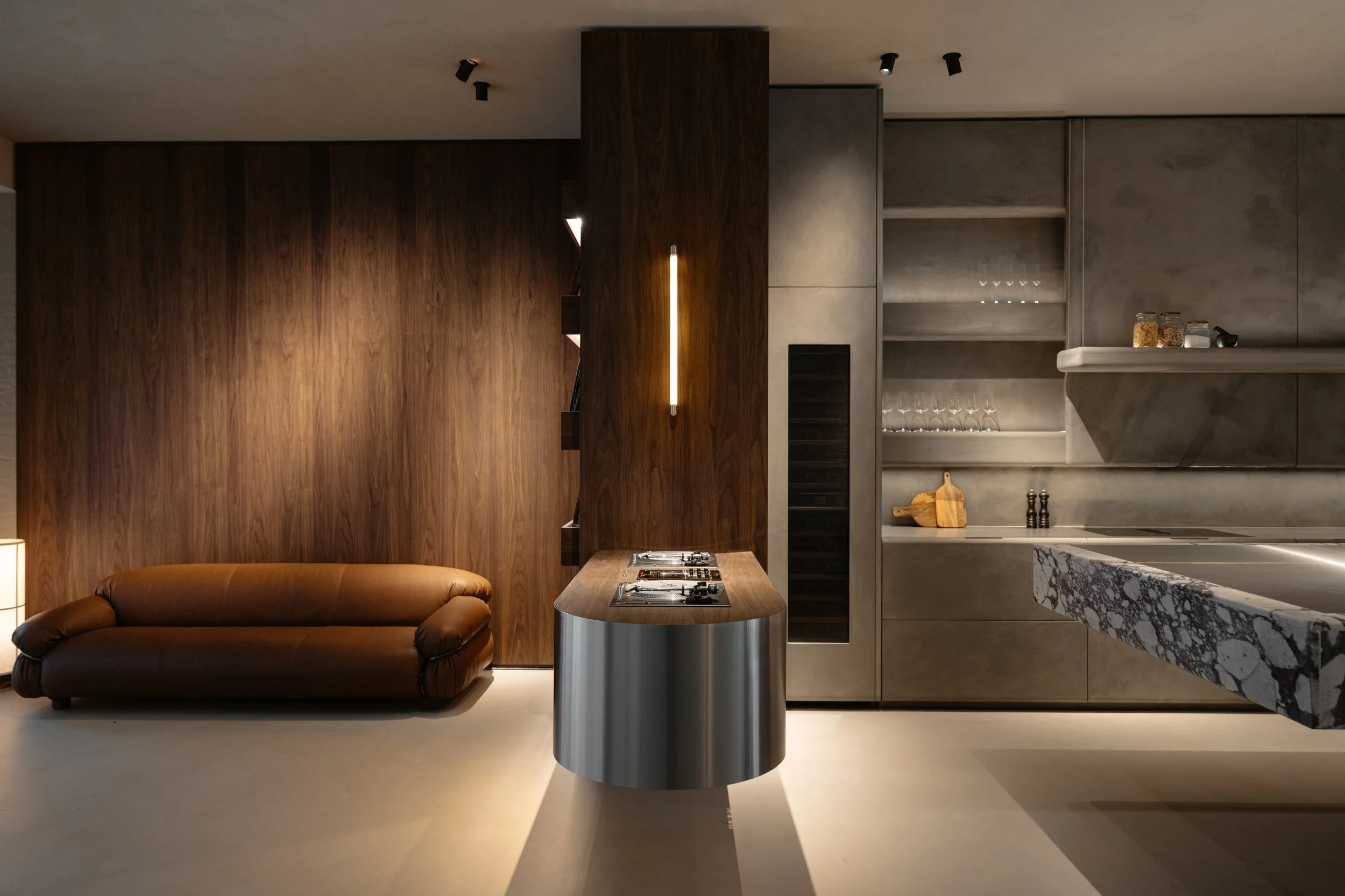The home base of Reiters Wings and Contrair Interiors. A place where we create. A social hub that inspires. And a versatile event space for cultural, corporate and private use. A custom DJ booth in stainless steel and walnut veneer anchors the space. The semi-floating kitchen island -Arabescato Viola marble with a stainless steel top, pairs with a grey-green microcement kitchen. Even the restroom stands out, with hand-applied gravel for a bold, brutalist look and a red-lit ceiling that adds a sensory edge.