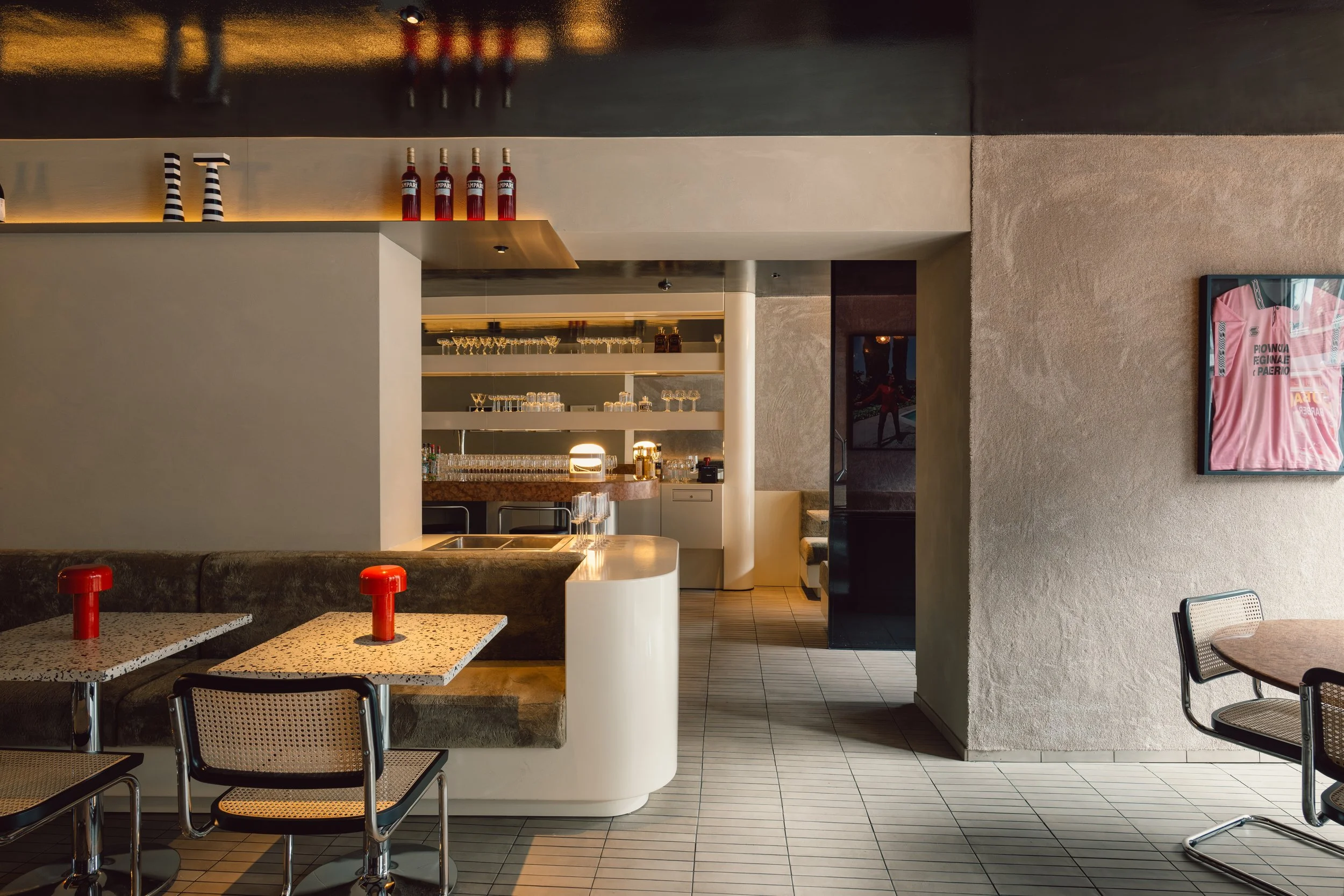 Osteria Figo is a bold reinterpretation of the Italian restaurant, located in the vibrant district of Wyck, Maastricht. We were invited to design the interior and visual identity, shaping a space where Italian tradition meets a playful, seventies-inspired attitude. The concept is rooted in contrast. Classic elements are redefined through contemporary materials, custom design and tactile finishes. From the vintage rectangular tiled floor to the deep black lacquered ceiling, every detail is carefully placed to create a setting that feels both intimate and expressive.